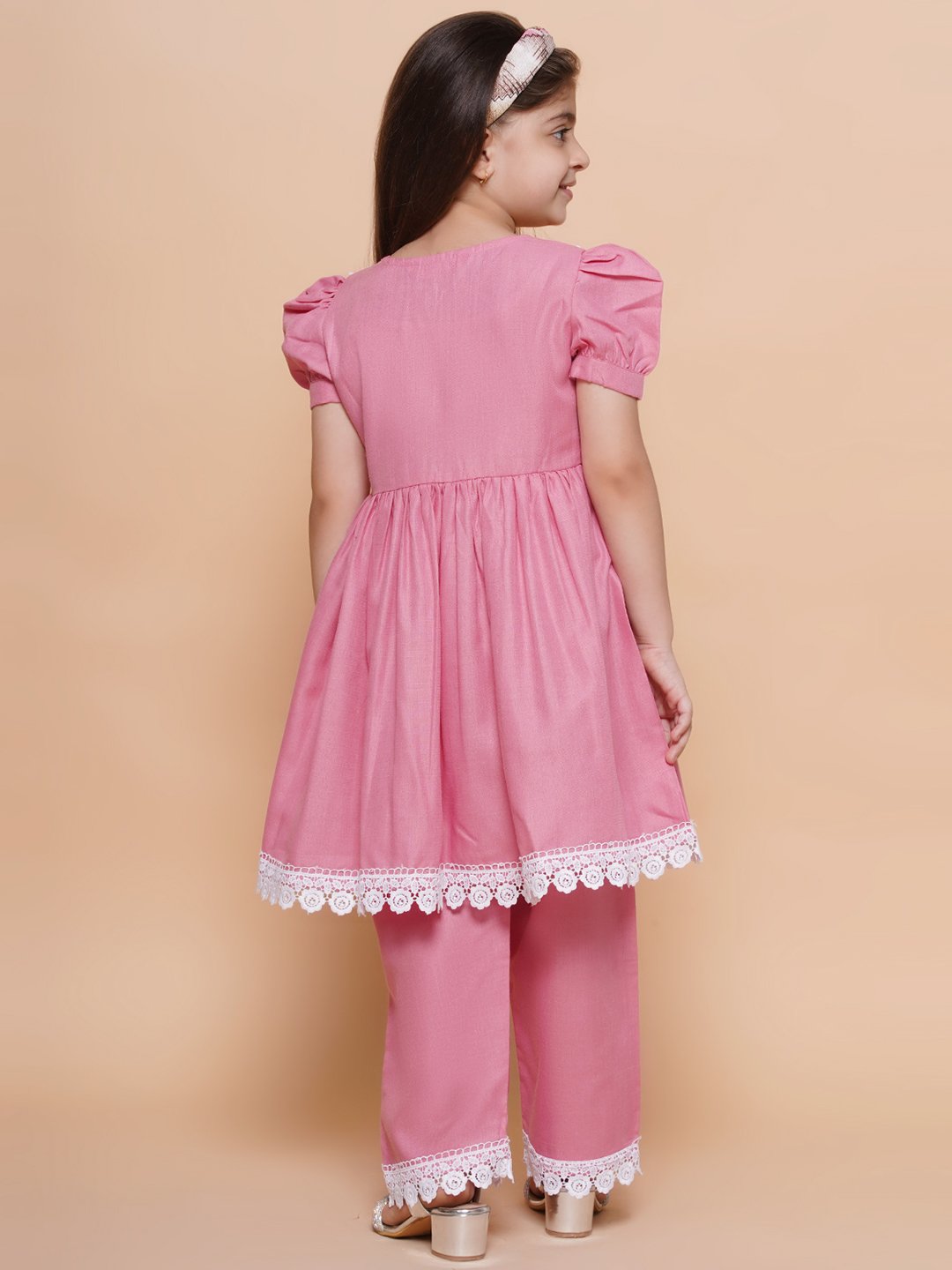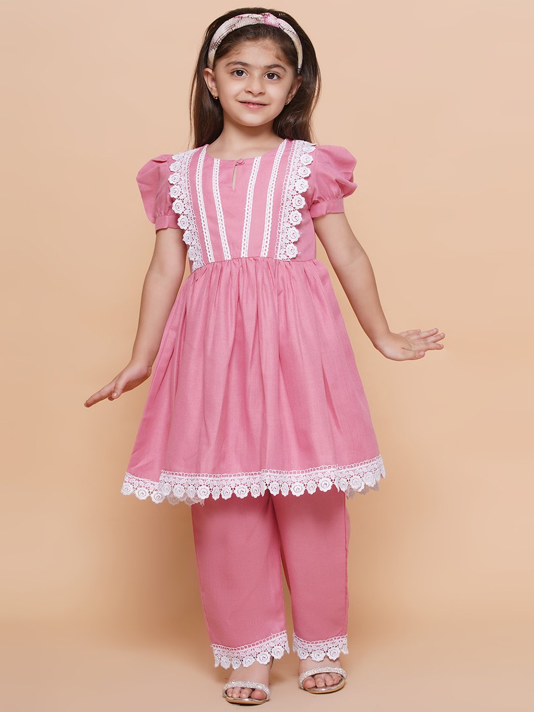 Delight your little one with this adorable pink ethnic dress set, featuring a puff-sleeve frock adorned with delicate white lace and matching pants. Made from soft, breathable fabric for all-day comfort, this outfit is perfect for festive occasions, parties, or casual outings. Includes a matching headband for added style!