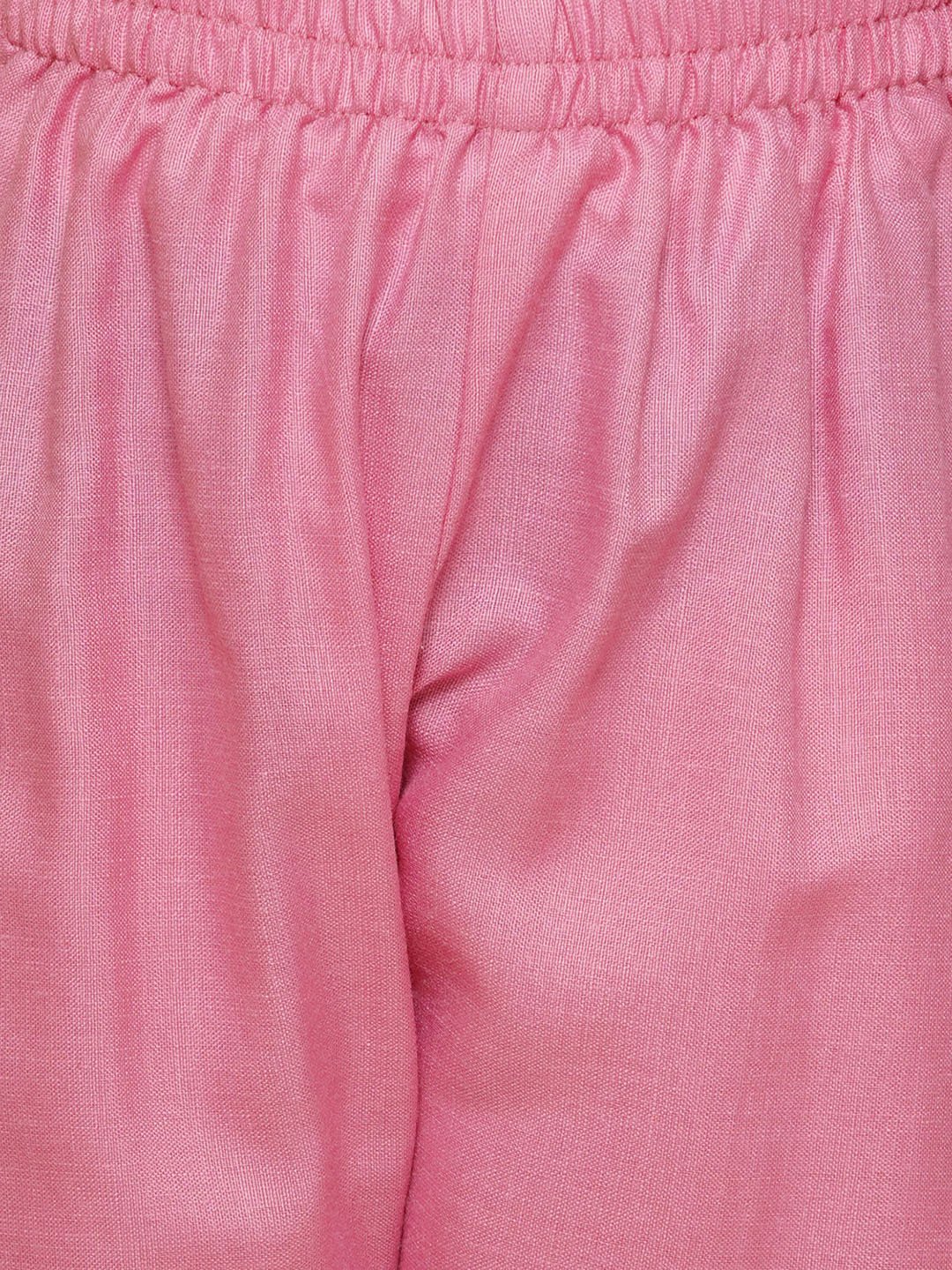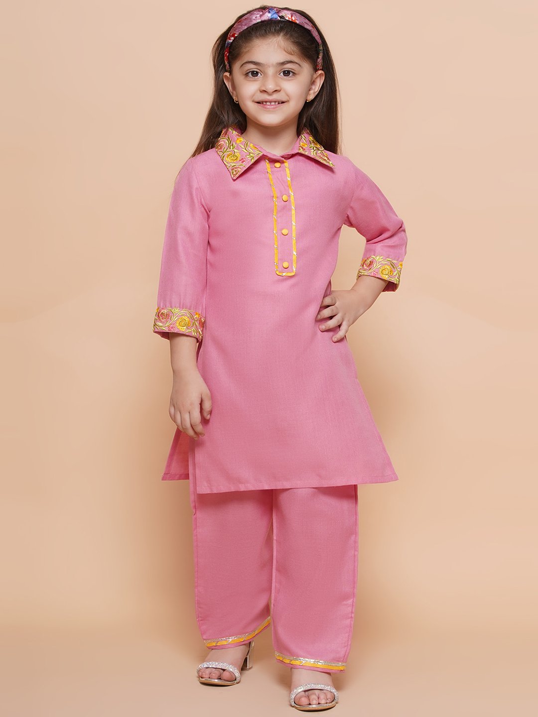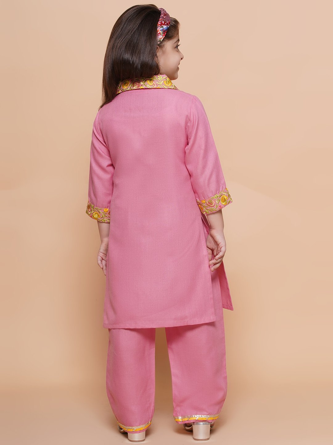 This charming pink kurta palazzo set for girls is perfect for festive occasions and family gatherings. Featuring delicate yellow embroidery on the collar, cuffs, and hem, the set brings together traditional and contemporary elements. Made from soft fabric, it ensures comfort and style for your little one. Includes a matching headband for a complete look.