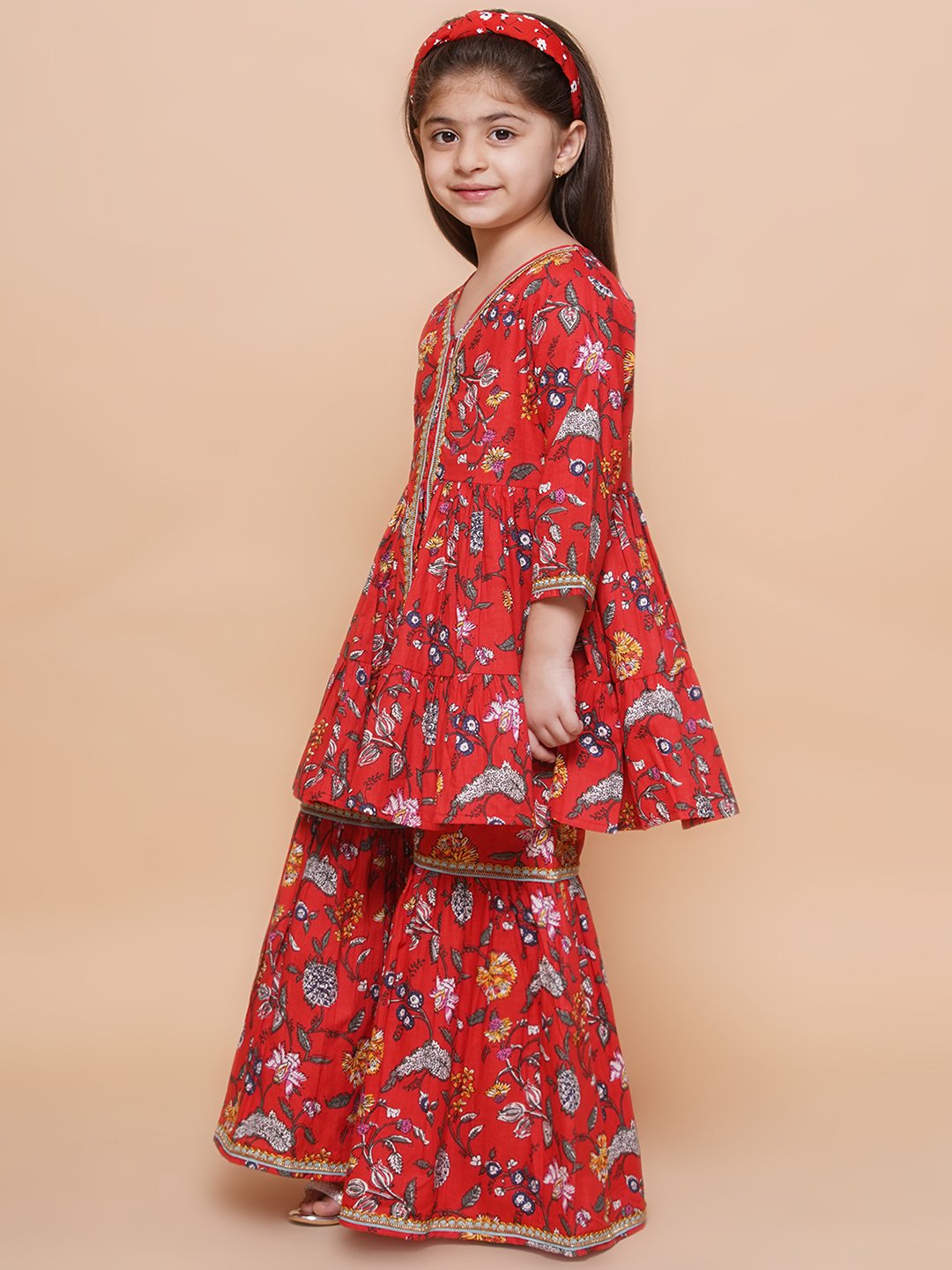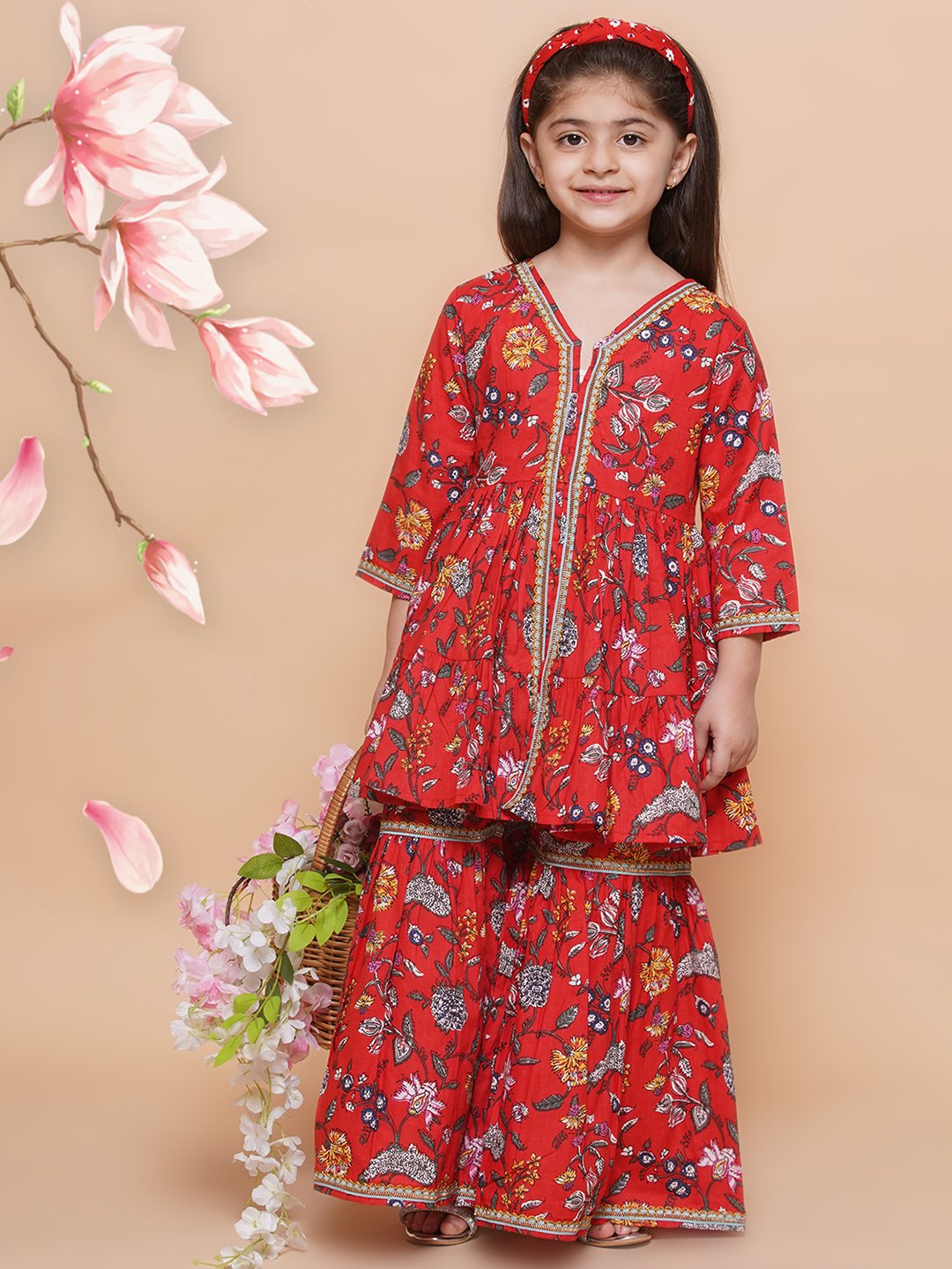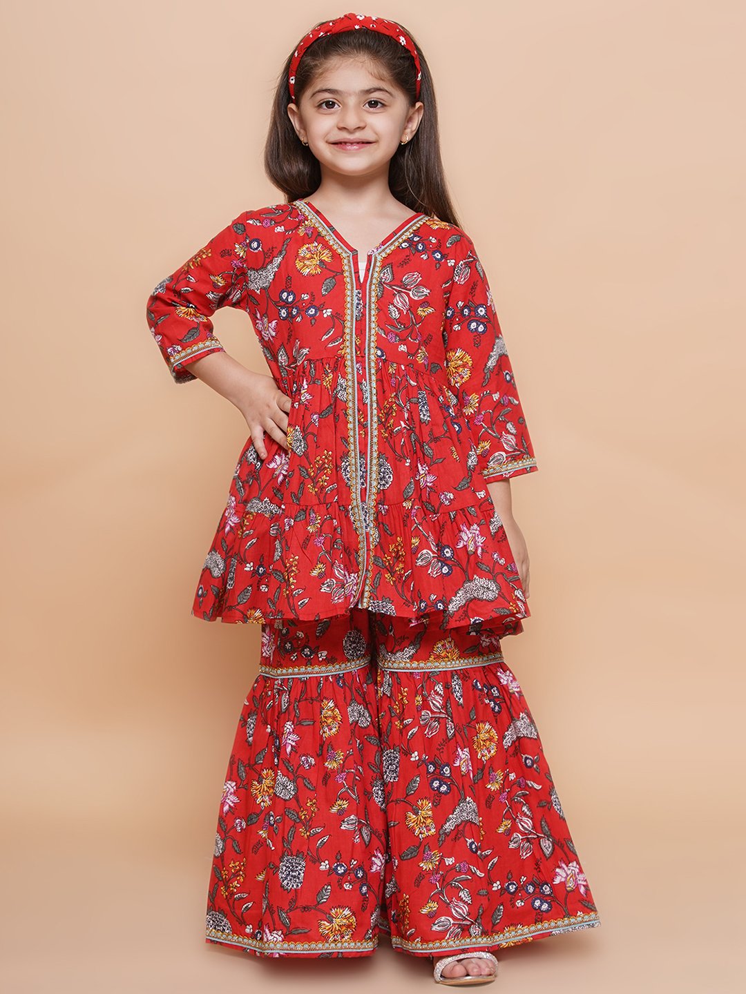 Brighten up your little one’s wardrobe with this stunning ethnic floral kurta set. Featuring a bold red color with beautiful floral prints, this outfit combines traditional style with modern flair. The flared sharara pants and matching headband offer comfort and style—perfect for festive occasions, cultural events, or family gatherings. Crafted with soft, breathable fabric for all-day ease.
