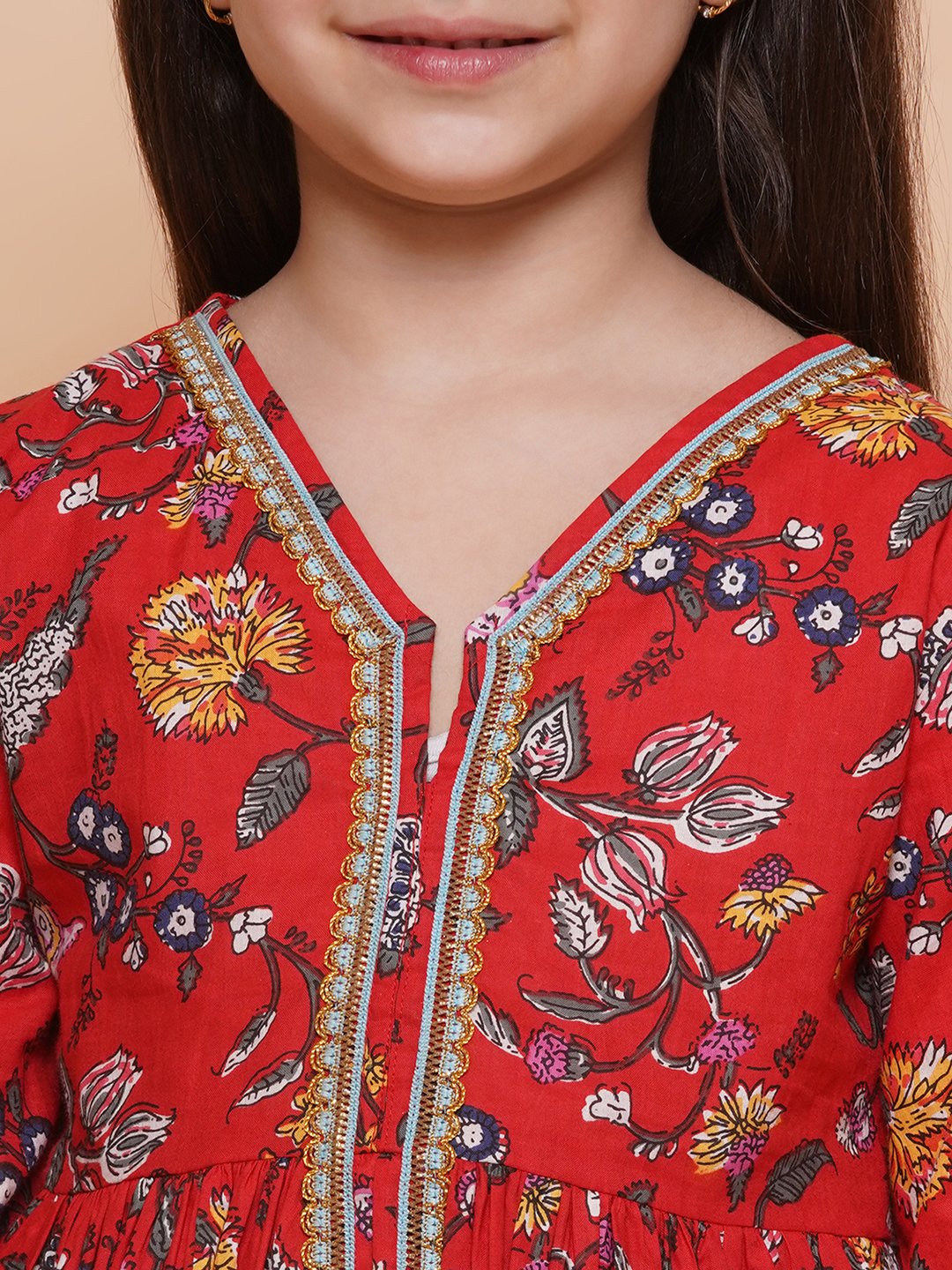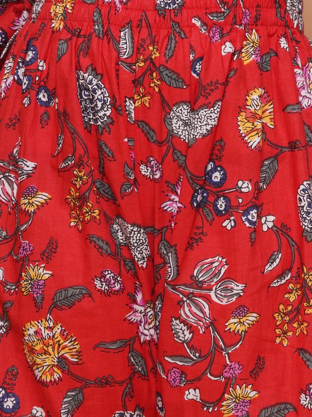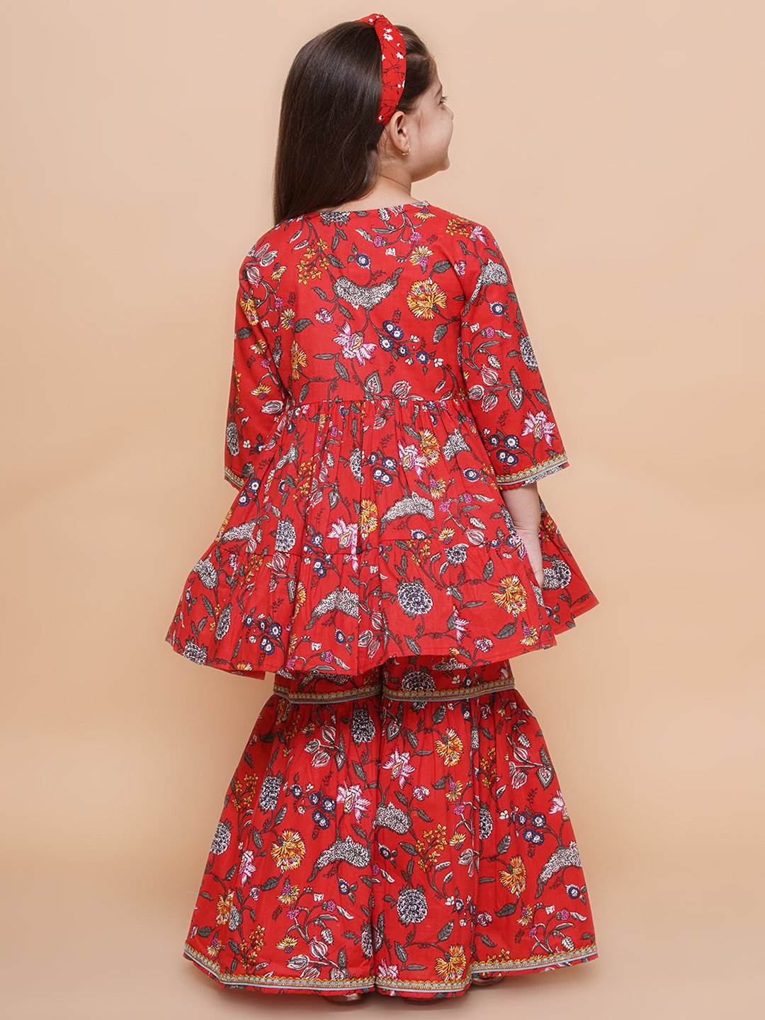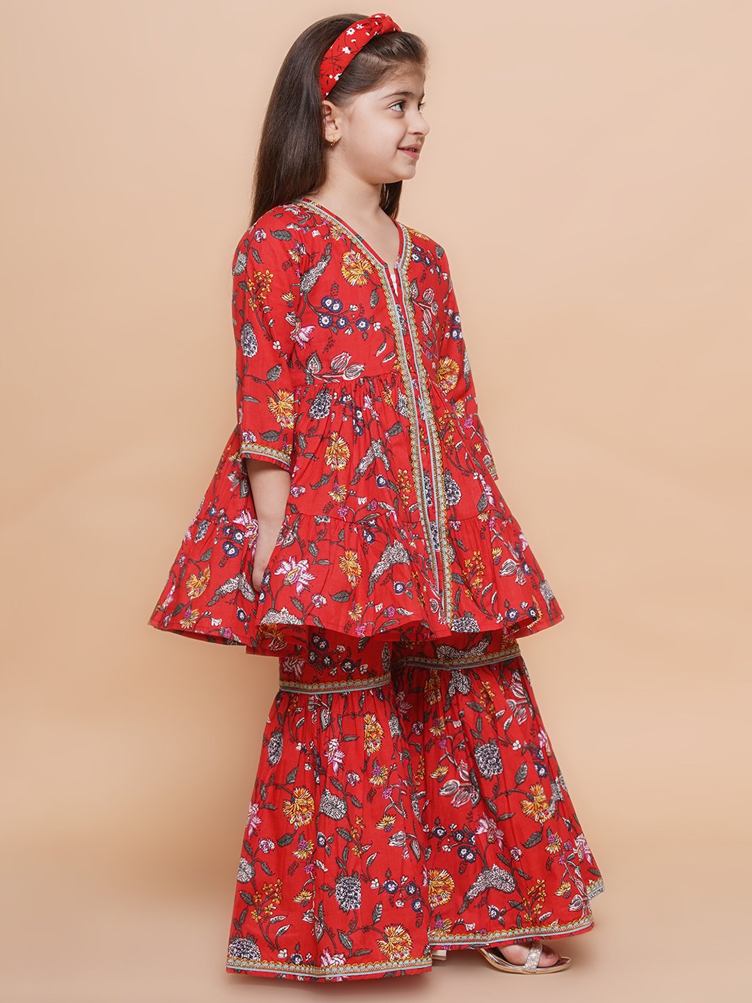 Brighten up your little one’s wardrobe with this stunning ethnic floral kurta set. Featuring a bold red color with beautiful floral prints, this outfit combines traditional style with modern flair. The flared sharara pants and matching headband offer comfort and style—perfect for festive occasions, cultural events, or family gatherings. Crafted with soft, breathable fabric for all-day ease.