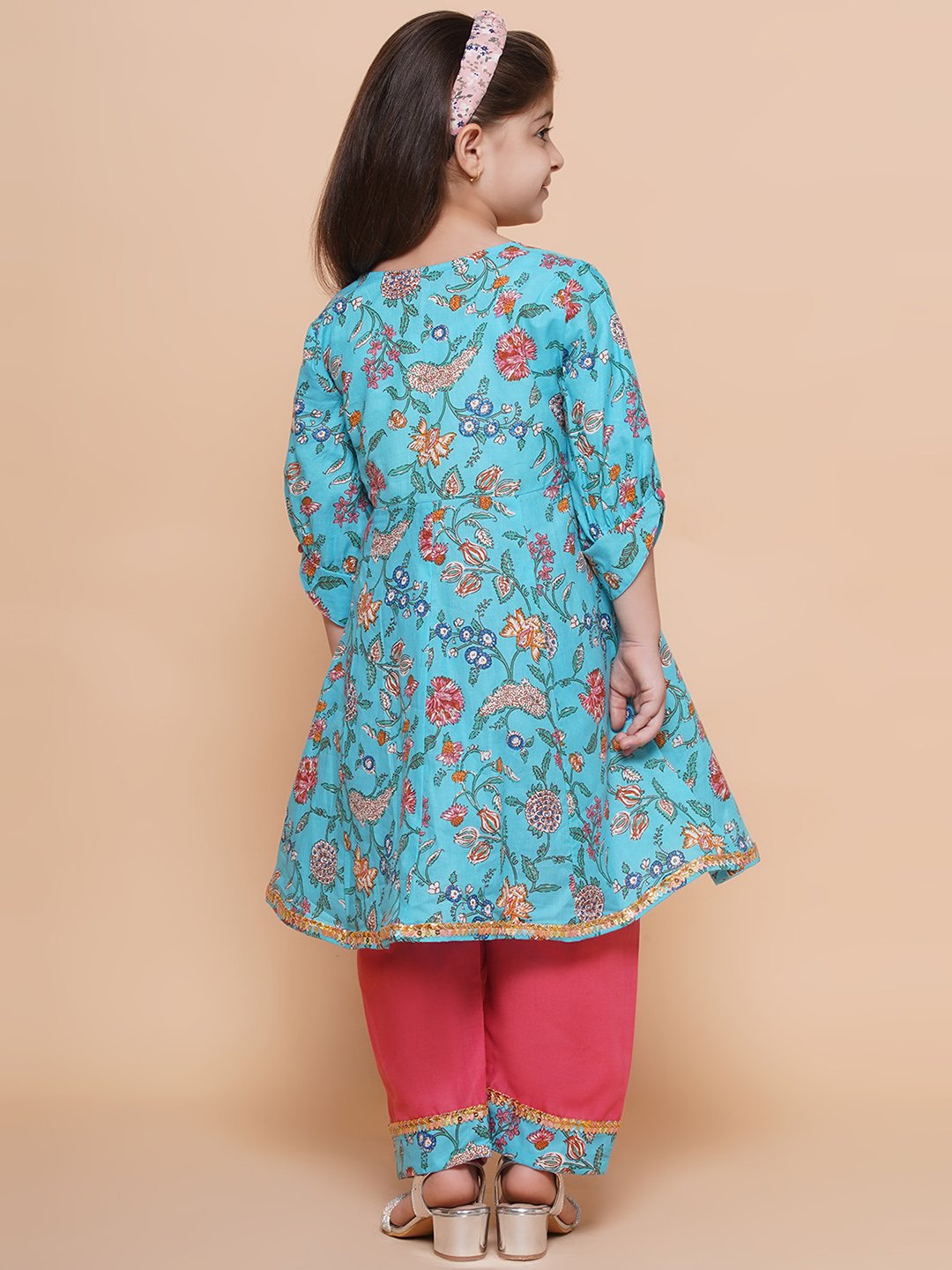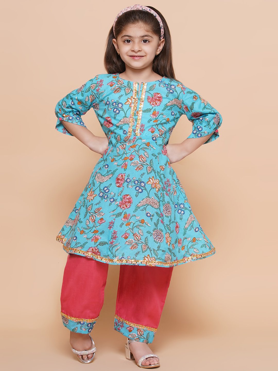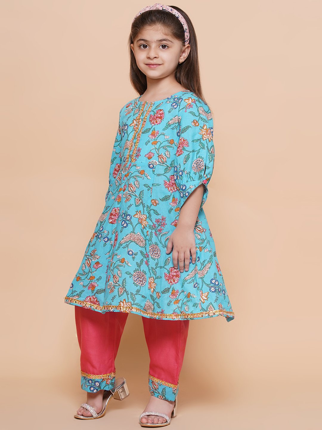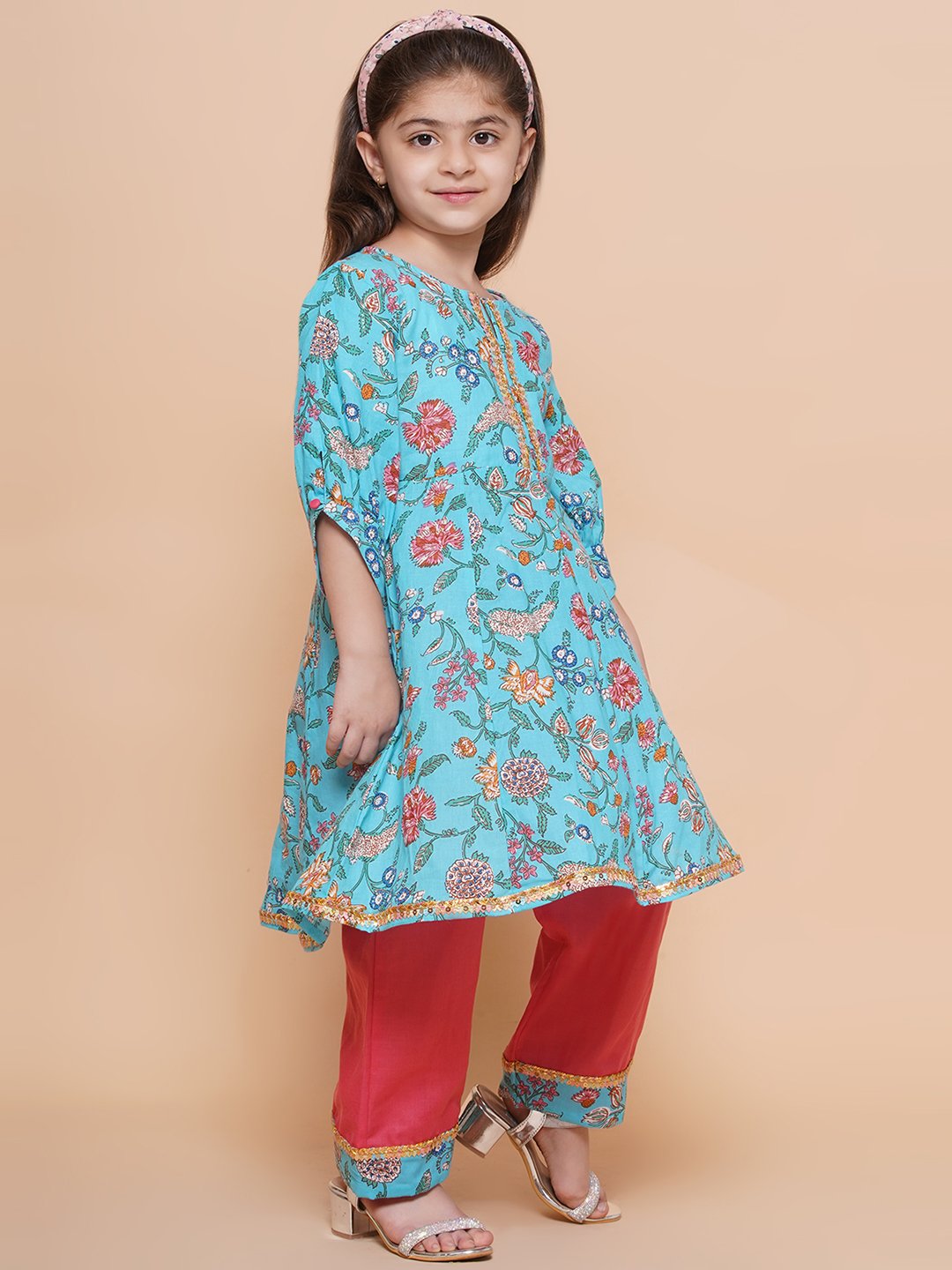 Add a splash of color to your little one’s wardrobe with this beautiful floral kurti set. The bright turquoise kurti features charming floral prints and decorative lace detailing, paired with contrasting red pants for a lively traditional look. Perfect for festive occasions, family gatherings, or casual wear, this outfit offers both comfort and style in premium cotton fabric.