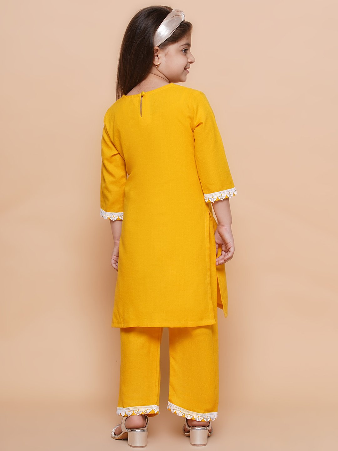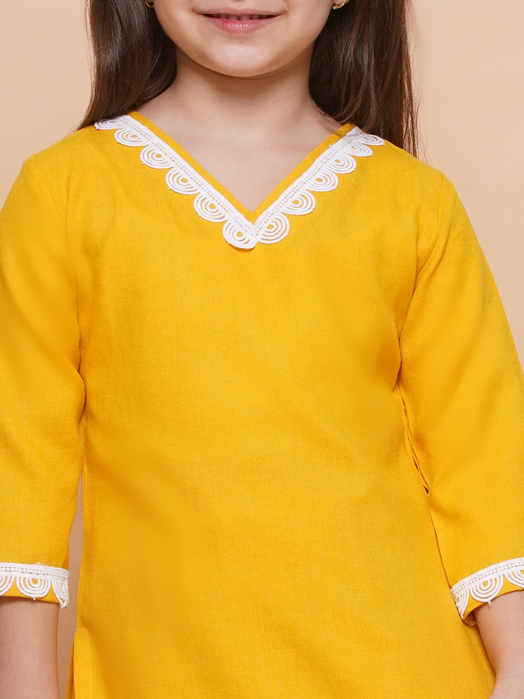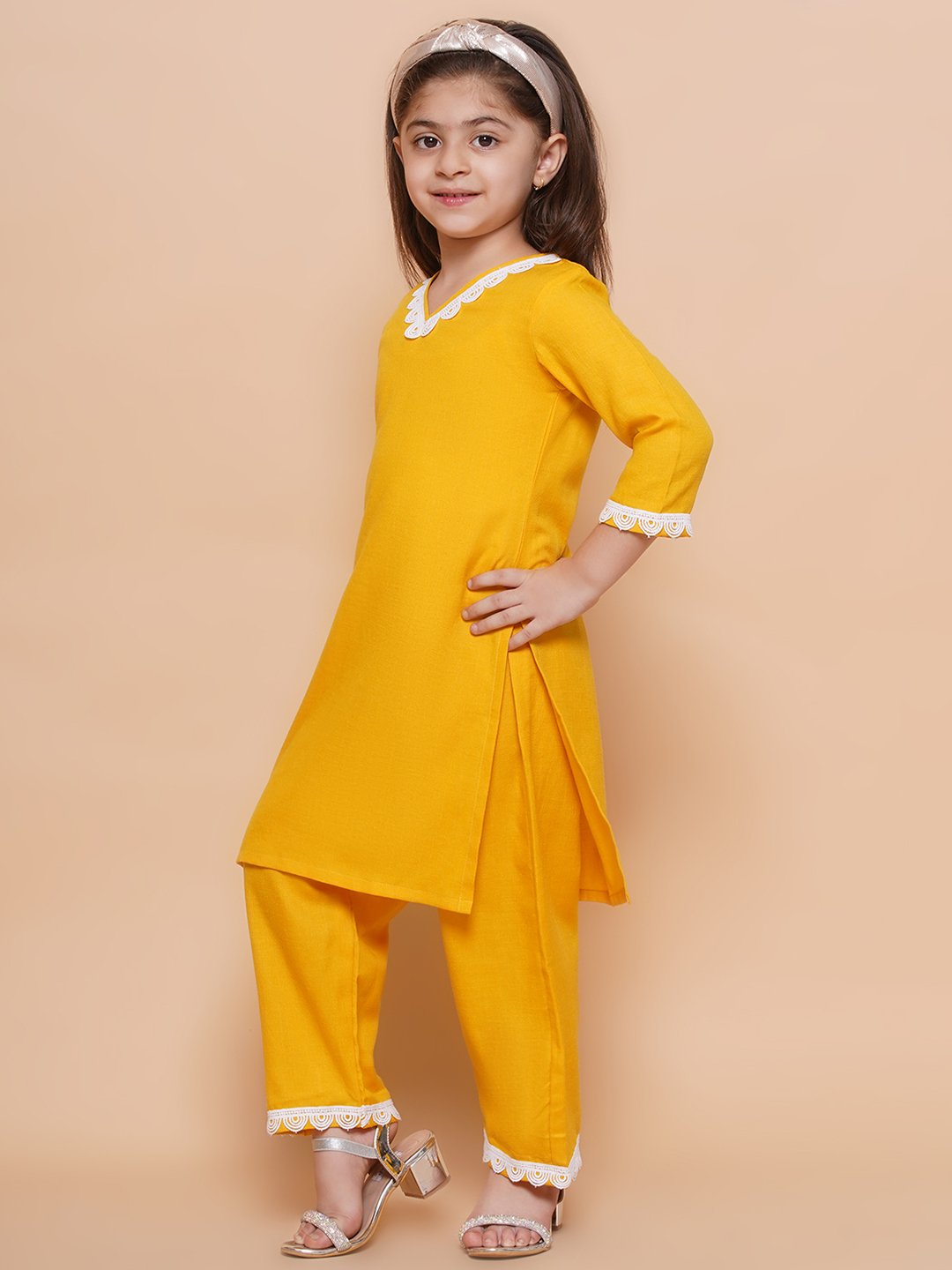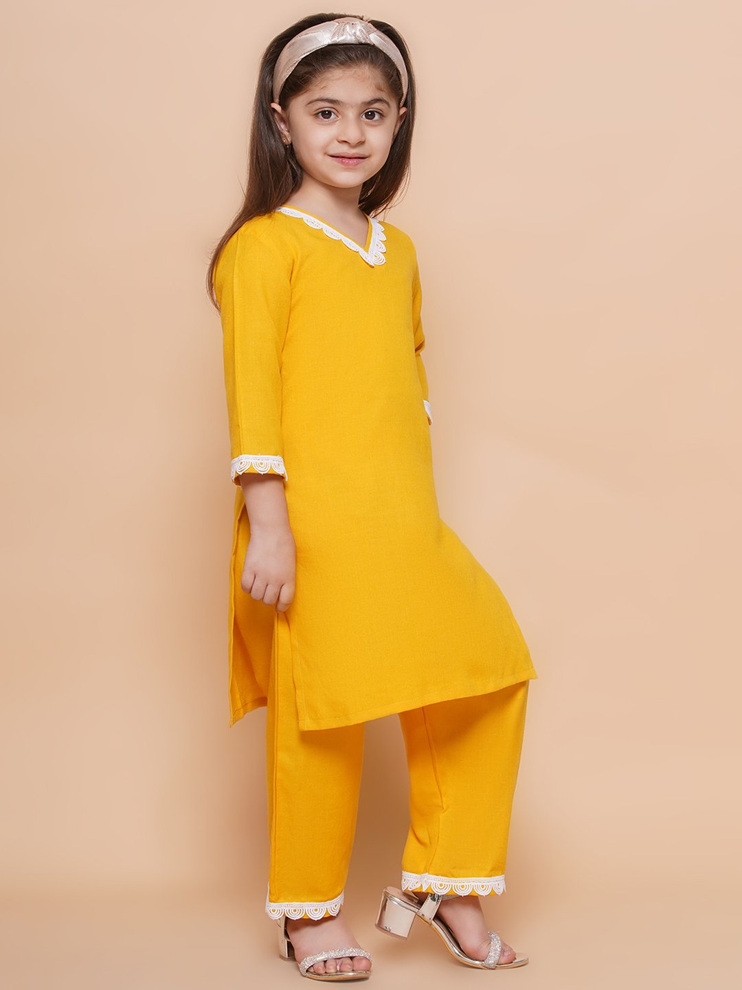 Brighten up your child’s wardrobe with this vibrant yellow kurta set, perfect for festive occasions and celebrations. The comfortable fabric ensures all-day ease, while the stylish white lace details add a touch of sophistication. Ideal for ages 5-16, this set includes a kurta and matching pants. Pair with accessories for an adorable look!